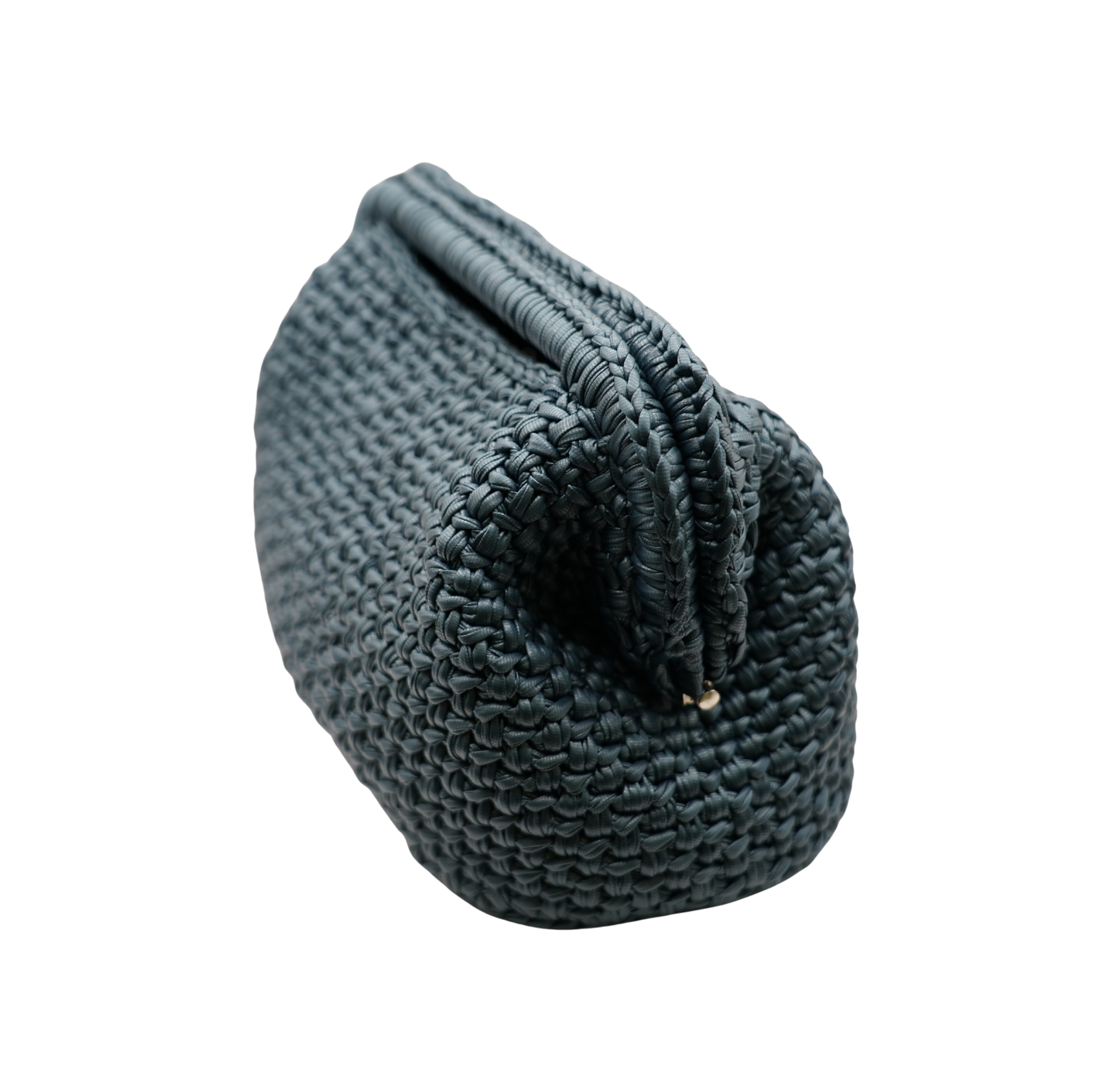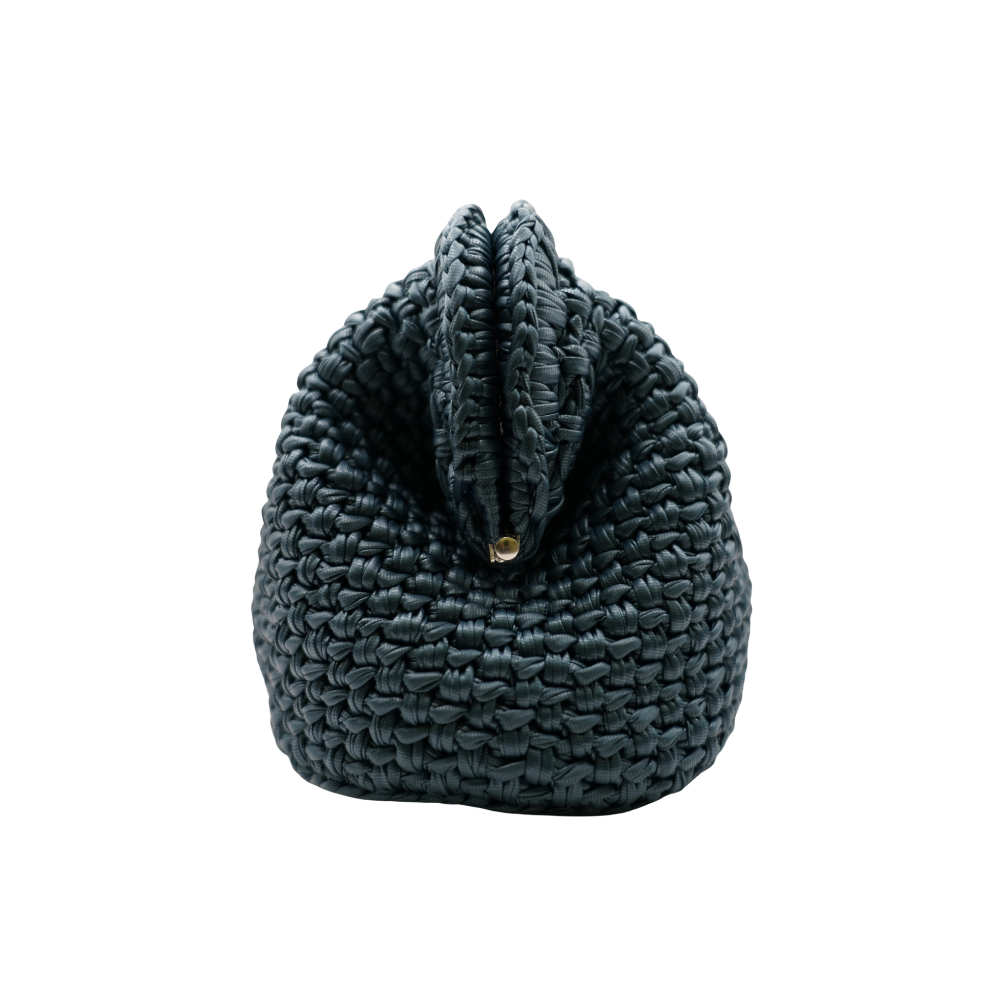 Intrecciata a mano in ecopelle nera satinata, ha una struttura compatta e sinuosa, con una texture intensa che cattura la luce e l’attenzione.